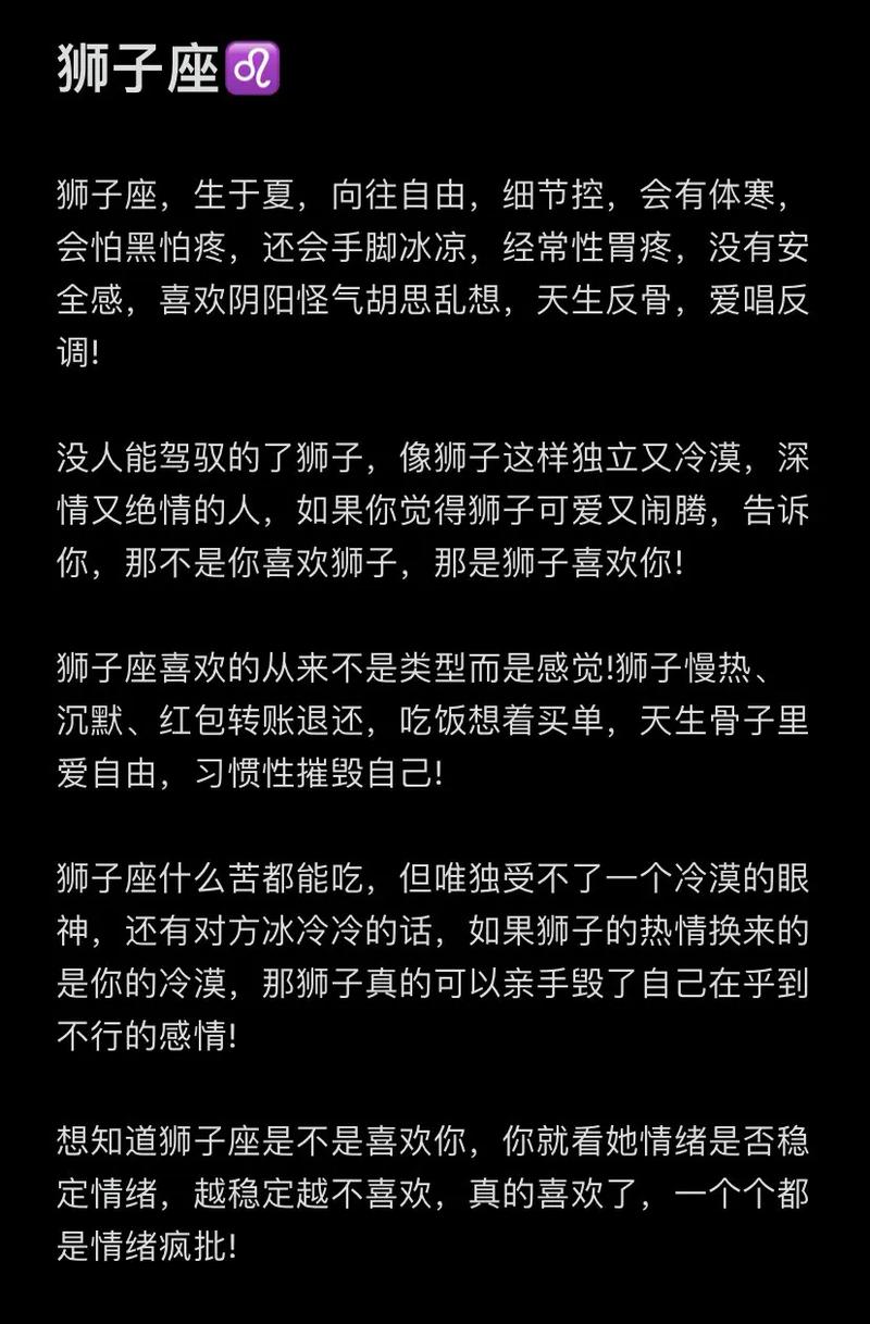 要避免这点,就是别太好胜,看来狮子座的女人心胸太宽广了!人是绝对好!由于狮子是一个决策者,所以在感情中常常比拟强势。这是很明显的一个特征。狮子女孩儿们绝不是装腔作势哭唧唧的小女生,她们具有宏大的能量,像太阳普通能用火热的爱来消融你。狮子座女生还非常的果断,爱了就告白,生气了就提出来,不爱了就分手,这是狮子女孩们分歧的行动规范。从狮子女孩儿们的这些性格特征中,我们能够看出来,这些标签在恋爱中,是有好有坏的。